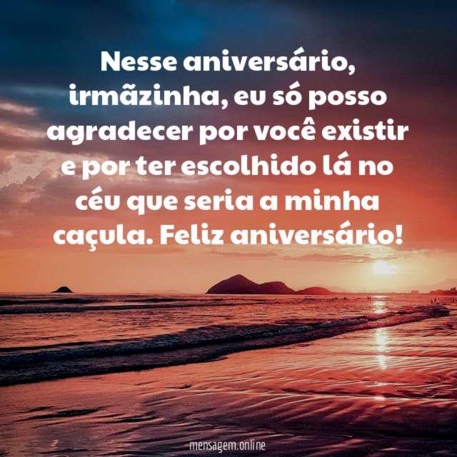 Você é a luz da minha vida, irmãzinha, e eu te amo demais. Nesse aniversário, desejo que todos os seus sonhos se realizem e que você seja sempre essa menina querida que você já é.