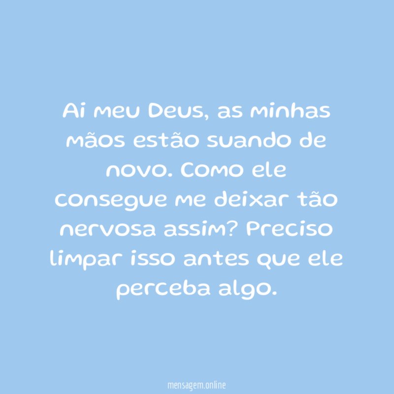 Ai meu Deus, as minhas mãos estão suando de novo. Como ele consegue me deixar tão nervosa assim? Preciso limpar isso antes que ele perceba algo.