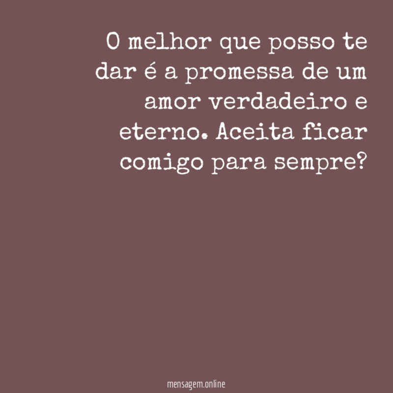 Você é o grande amor da minha vida e o responsável pela felicidade que habita em minha vida. Esse sentimento é o mais belo e mais gratificante que já senti. Só peço que ele seja eterno.