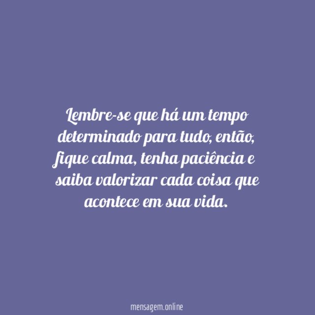 Lembre-se que há um tempo determinado para tudo, então, fique calma, tenha paciência e saiba valorizar cada coisa que acontece em sua vida.