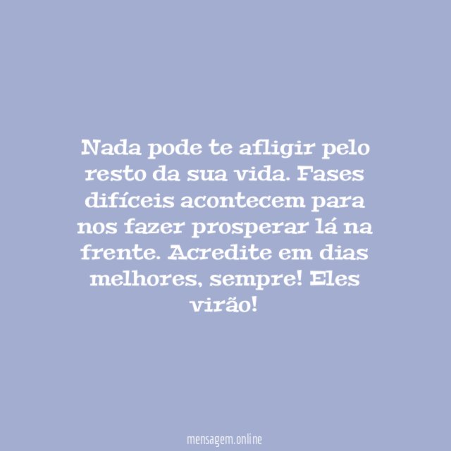 Nada pode te afligir pelo resto da sua vida. Fases difíceis acontecem para nos fazer prosperar lá na frente. Acredite em dias melhores, sempre! Eles virão!