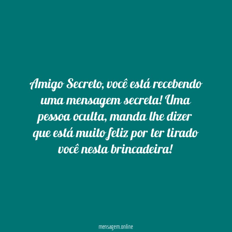 Amigo Secreto, você está recebendo uma mensagem secreta! Uma pessoa oculta, manda lhe dizer que está muito feliz por ter tirado você nesta brincadeira!