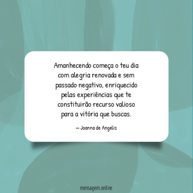 Bom dia pra você! Bom dia vida. Bom dia trabalho. Bom dia fé. Bom dia coragem. Bom dia alegria. Bom dia família. Bom dia Deus, bom dia amigos!