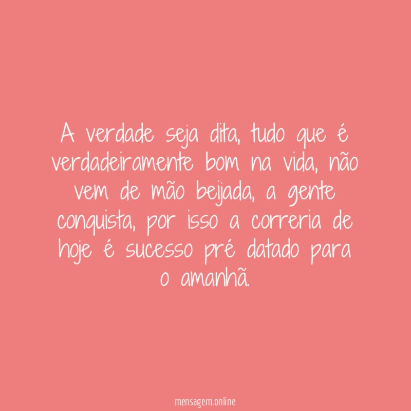A verdade seja dita, tudo que é verdadeiramente bom na vida, não vem de mão beijada, a gente conquista, por isso a correria de hoje é sucesso pré datado para o amanhã.