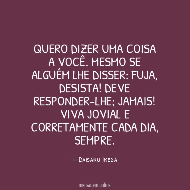 "Quero dizer uma coisa a você. Mesmo se alguém lhe disser: fuja, desista! Deve responder-lhe; jamais! Viva jovial e corretamente cada dia, sempre."