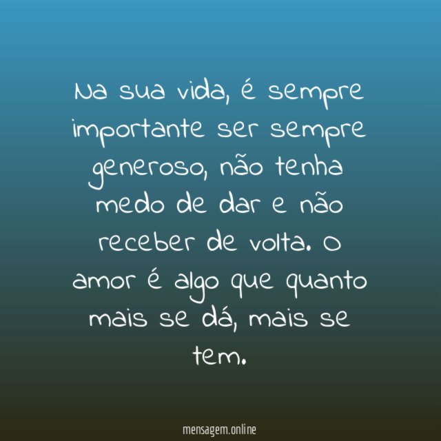 Na sua vida, é sempre importante ser sempre generoso, não tenha medo de dar e não receber de volta. O amor é algo que quanto mais se dá, mais se tem.