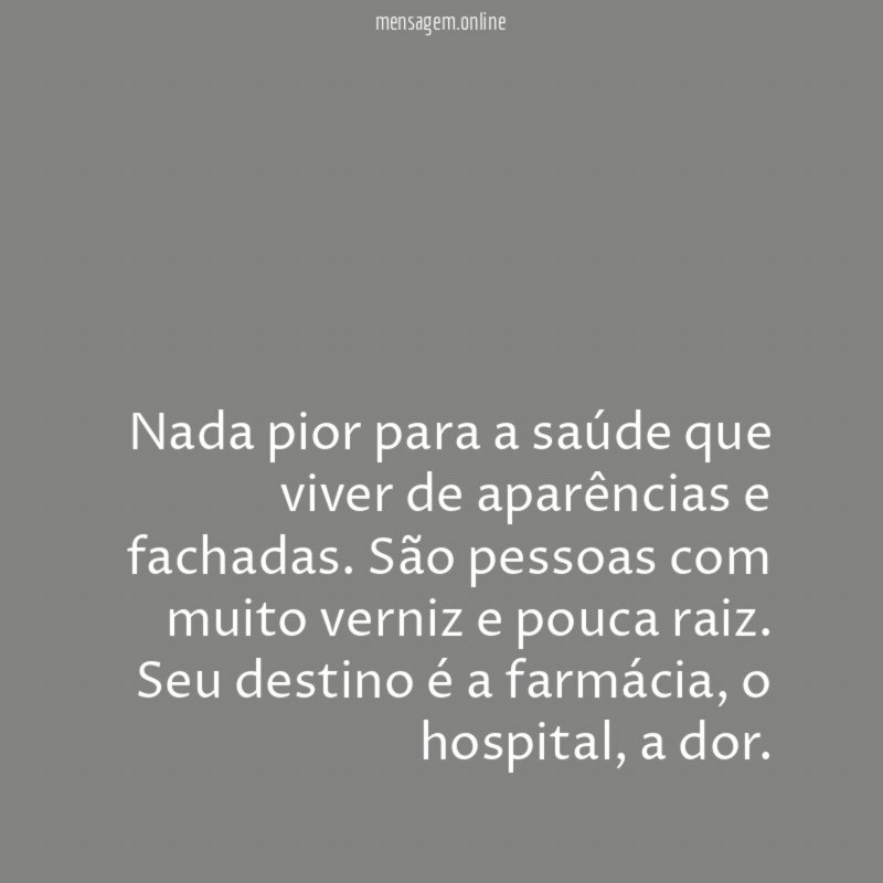 Nada pior para a saúde que viver de aparências e fachadas. São pessoas com muito verniz e pouca raiz. Seu destino é a farmácia, o hospital, a dor.