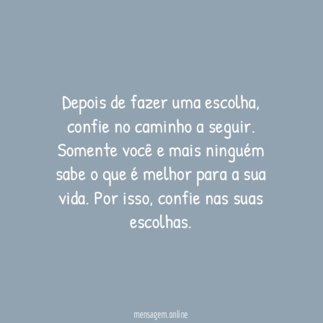 Acredite em você, independentemente do que você esteja sentido, da aflição que esteja dentro do seu coração. Você conseguirá encontrar o melhor caminho a seguir e conseguirá alcançar os seus objetivos…