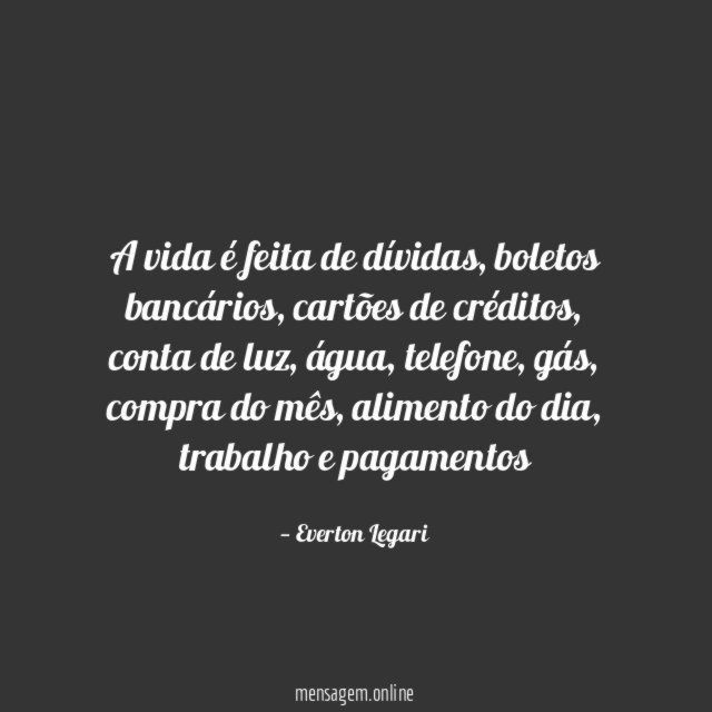"A vida é feita de dívidas, boletos bancários, cartões de créditos, conta de luz, água, telefone, gás, compra do mês, alimento do dia, trabalho e pagamentos"