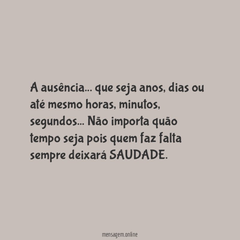 A ausência… que seja anos, dias ou até mesmo horas, minutos, segundos… Não importa quão tempo seja pois quem faz falta sempre deixará SAUDADE.