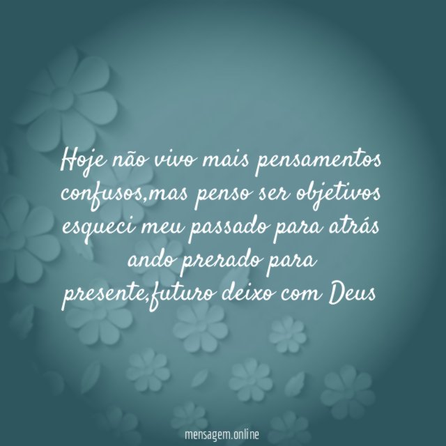 hoje não vivo mais pensamentos confusos, mas penso ser objetivos esqueci meu passado para atrás ando prerado para presente, futuro deixo com Deus
