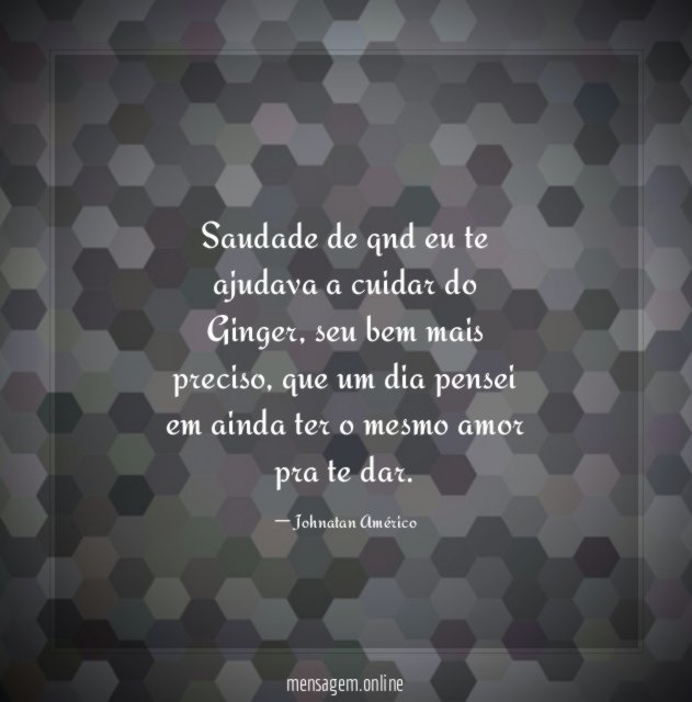 Saudade de qnd eu te ajudava a cuidar do Ginger, seu bem mais preciso, que um dia pensei em ainda ter o mesmo amor pra te dar.