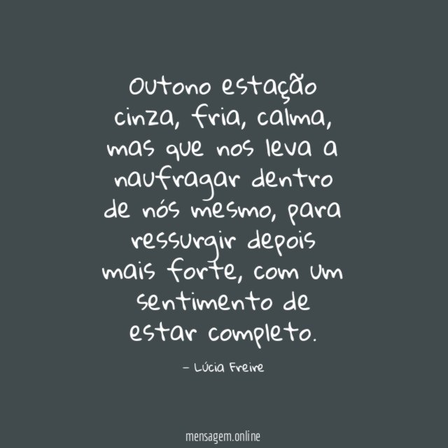 Outono estação cinza, fria, calma, mas que nos leva a naufragar dentro de nós mesmo, para ressurgir depois mais forte, com um sentimento de estar completo.