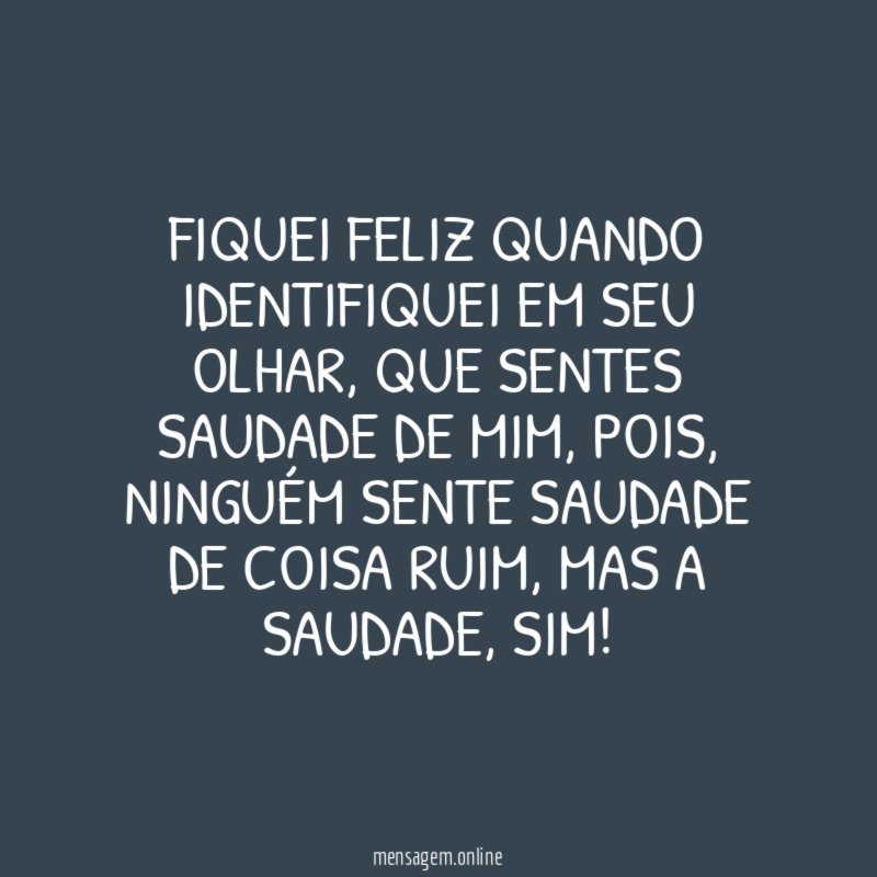 FIQUEI FELIZ QUANDO IDENTIFIQUEI EM SEU OLHAR, QUE SENTES SAUDADE DE MIM, POIS, NINGUÉM SENTE SAUDADE DE COISA RUIM, MAS A SAUDADE, SIM!