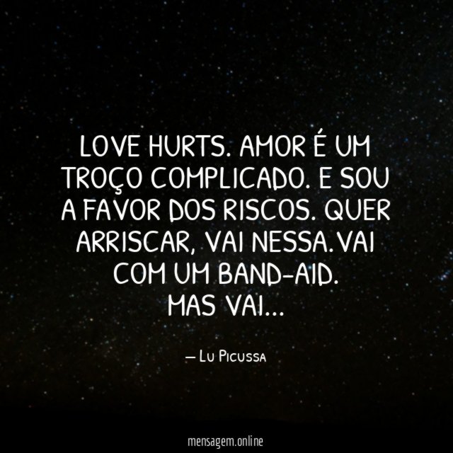 Love hurts. Amor é um troço complicado. E sou a favor dos riscos. Quer arriscar, vai nessa.Vai com um band-aid.