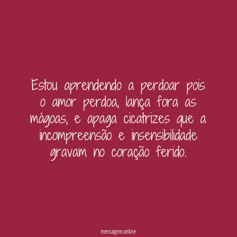 Estou aprendendo a perdoar pois o amor perdoa, lança fora as mágoas, e apaga cicatrizes que a incompreensão e insensibilidade gravam no coração ferido.