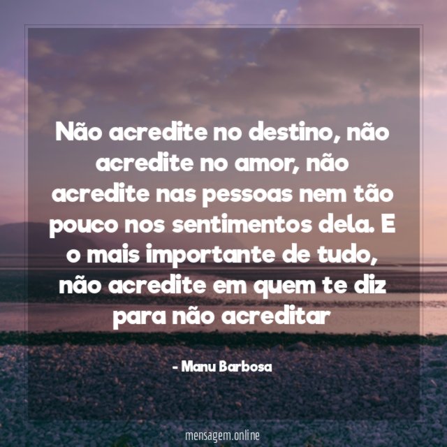 Não acredite no destino, não acredite no amor, não acredite nas pessoas nem tão pouco nos sentimentos dela. E o mais importante de tudo, não acredite em quem te diz para não acreditar