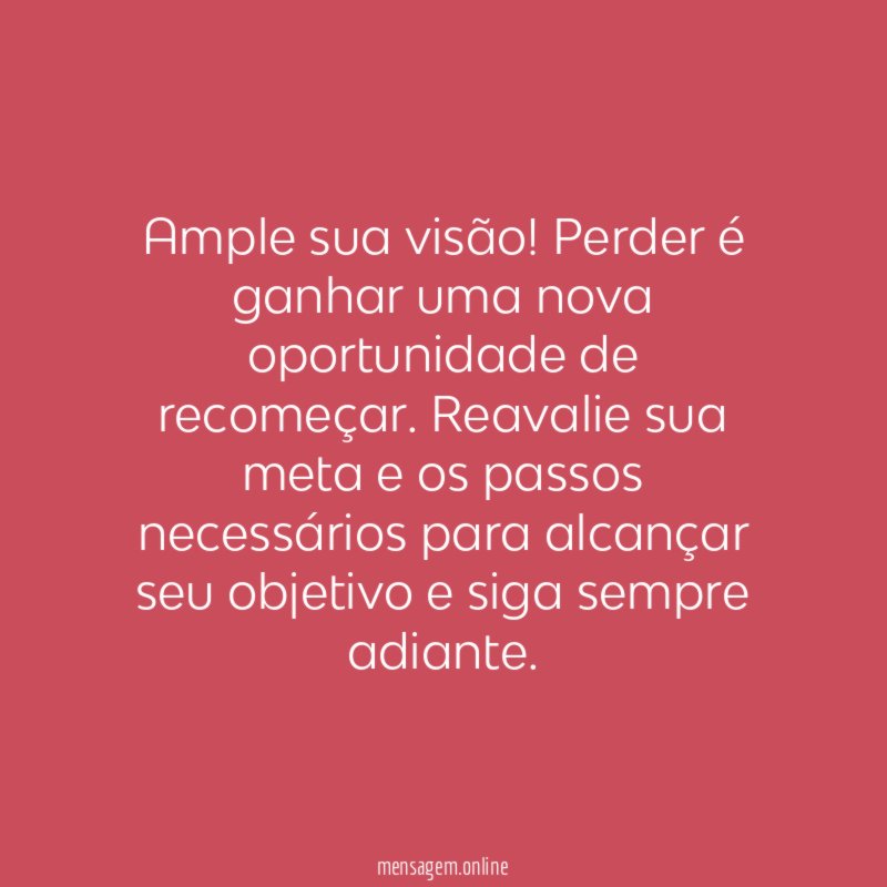 Ample sua visão! Perder é ganhar uma nova oportunidade de recomeçar. Reavalie sua meta e os passos necessários para alcançar seu objetivo e siga sempre adiante.