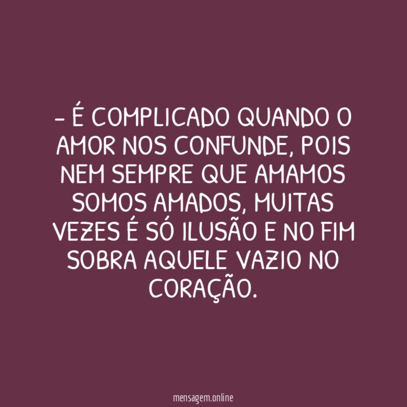- É COMPLICADO QUANDO O AMOR NOS CONFUNDE, POIS NEM SEMPRE QUE AMAMOS SOMOS AMADOS, MUITAS VEZES É SÓ ILUSÃO E NO FIM SOBRA AQUELE VAZIO NO CORAÇÃO.